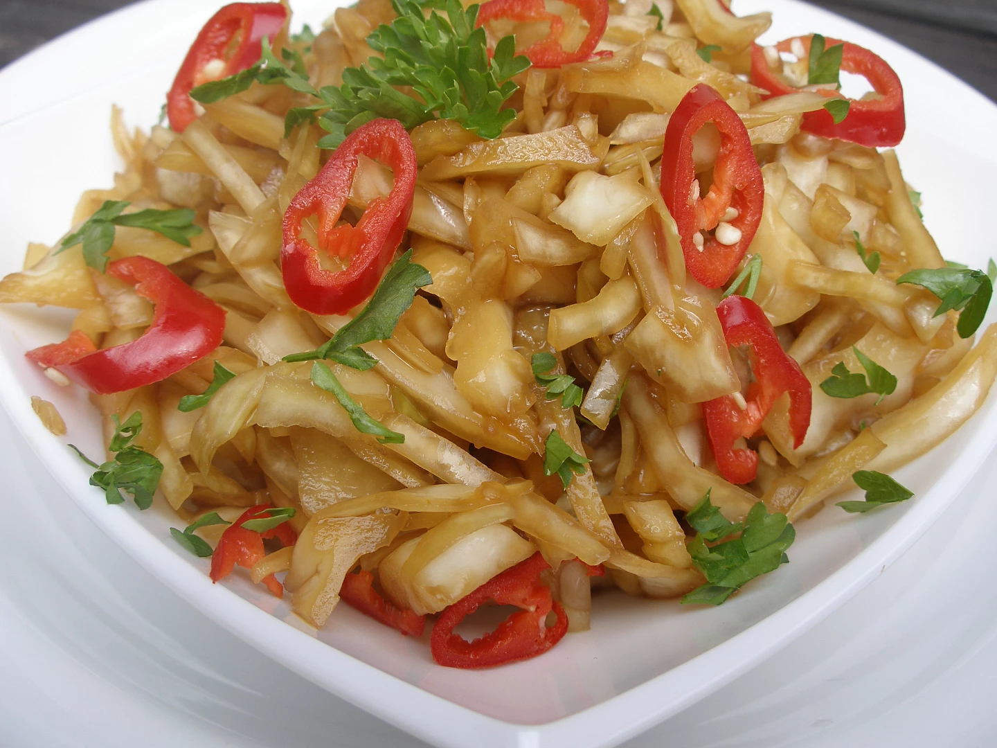 Méně obvyklá ochucovadla, česnek a hlavně feferonky dodávají tomuto salátu pikantní příchuť Asie. Migrace východních národů se nutně projevuje i vzájemným prolínáním a obohacováním národních kuchyní.