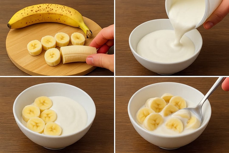 Rychlou a zdravou snídani nebo svačinu – stačí jen nakrájet zralý banán a přidat ho do vašeho oblíbeného jogurtu. Můžete ji běžně dochutit nebo ozvláštnit podle chuti.