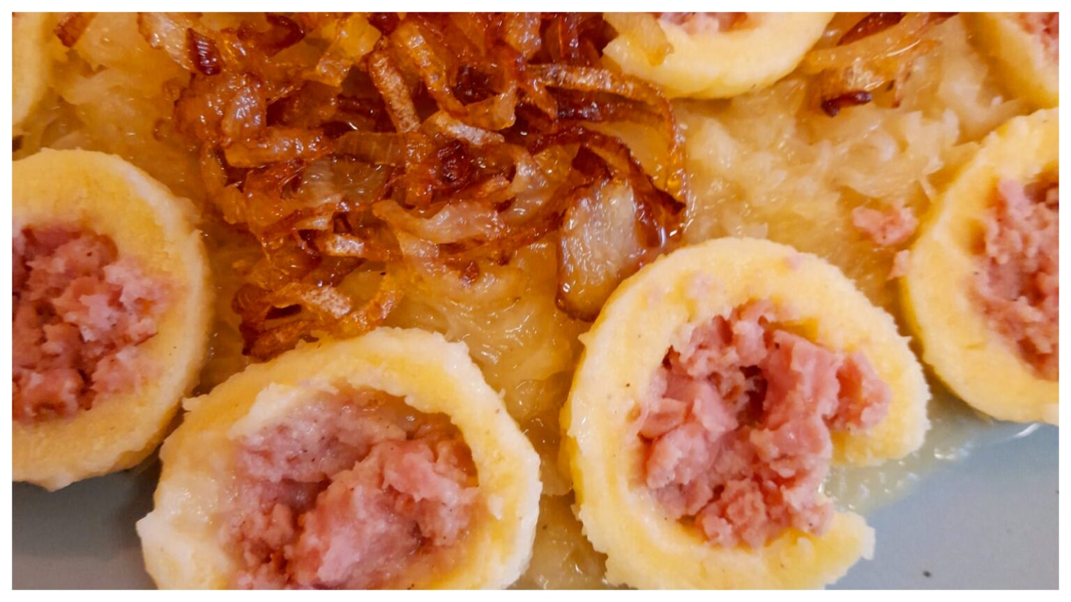 Bramborové knedlíky s uzeným masem, kysané zelí a smažená cibulka