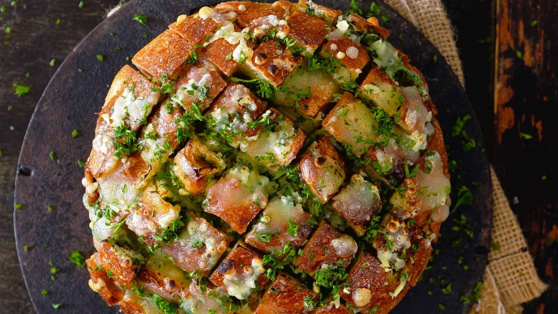Domácí chleba, rovnou zapečený s ochuceným máslem a sýrem – vtipné, nijak obtížné a dost návykové. Jako dělané na večírek!