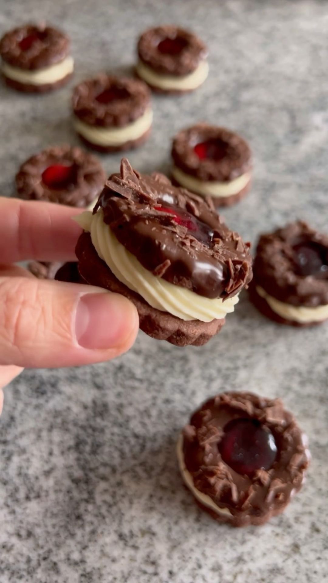 Jemné čokoládové sušenky s višňovým džemem a bílou ganache recept