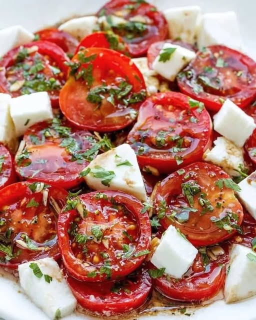 Tento salát z marinovaných rajčat s mozzarellou je neuvěřitelně osvěžující a plný chuti, perfektní na letní dny, grilování nebo lehký oběd! Díky kombinaci bylinek, česneku a balzamikového octa získají rajčata výraznou a bohatou chuť. 🌿🍅