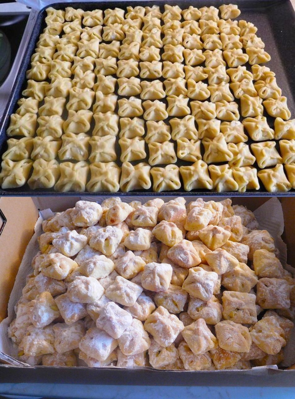 Poté těsto vyválíme na tloušťku asi 3-4 mm, vykrájíme čtverce, přidáme libovolnou náplň (mně chutná nejlépe máková) a všechny čtyři rohy přehneme k sobě.
