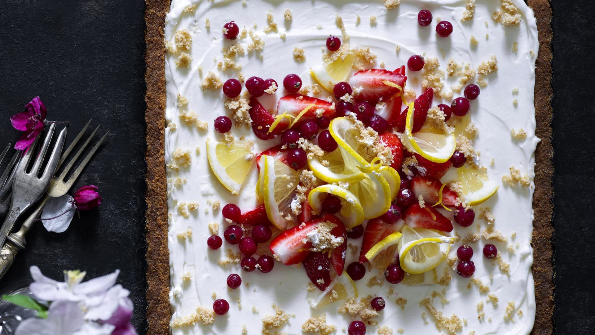 V létě pochopitelně nepečený, samozřejmě inspirovaný cheesecakem, ale tak krásný, efektní a přetékající letním ovocem (jehož chuť skvěle odpichuje svěží citronový krém), že by se mohl stát ozdobou jakékoliv slavnostní příležitosti.