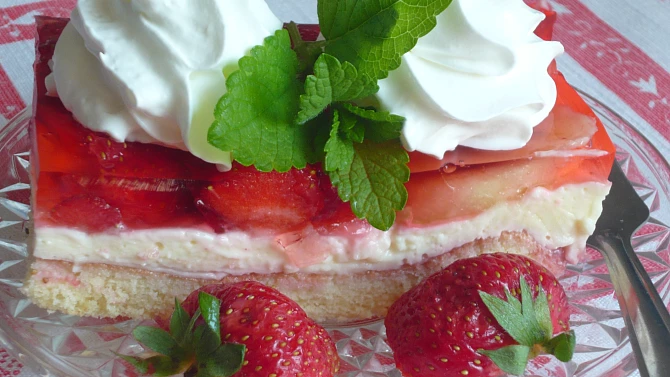 Máte chuť na svěží ovocný dezert? Vyzkoušejte tyto řezy, které si oblíbíte díky skvělému vzhledu i chuti. Tvoří je piškotové těsto, jednoduchý krém z vanilkového pudinku a tvarohu, a čerstvé ovoce zalité želatinou.