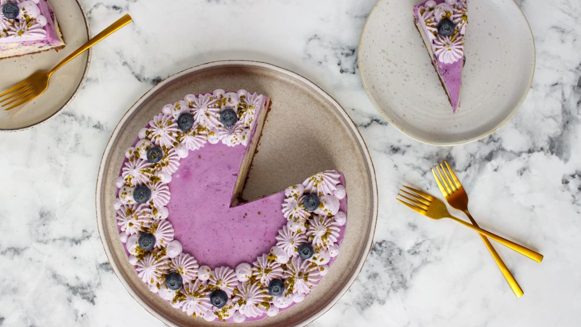 Nepečený pistáciovo-borůvkový cheesecake od Katky Šiškové z blogu Na vidličku