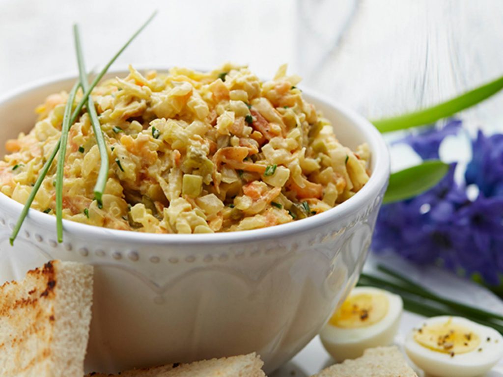 Na pomazánku z kořenové zeleniny použijeme ingredience, které míváme běžně doma. Stačí nám mrkev, celer, petržel a cibule. To vše dochutíme majonézou, hořčicí a ozdobíme pažitkou.
