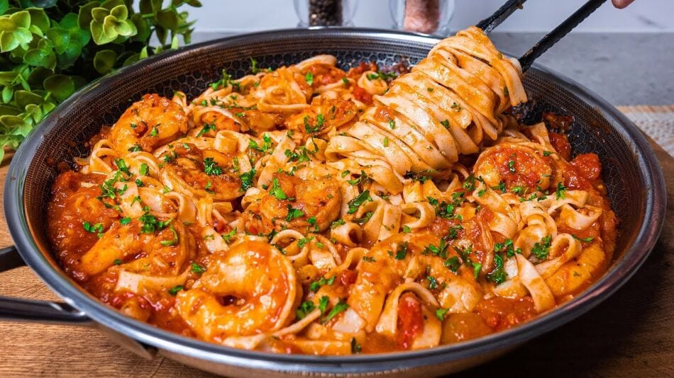 Oblíbené těstoviny na rajčatech se smaženými krevetami