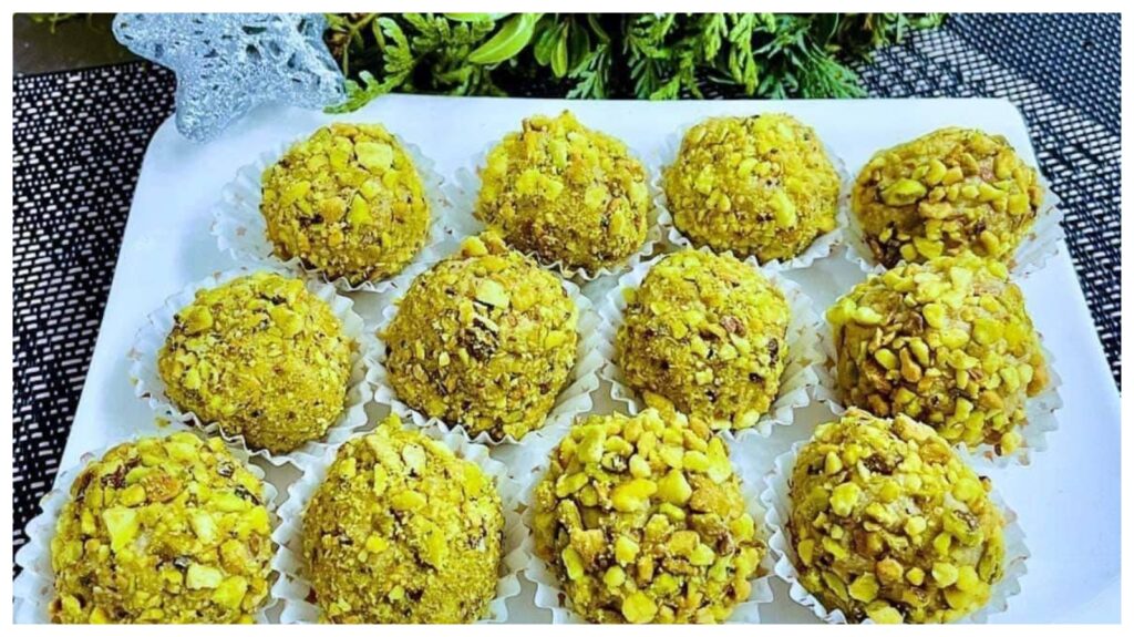 Ingredience: 100 g másla 50 g moučkového cukru 300 g dětských piškotů 100 g sušeného mléka 100 g nesolených pistáciových oříšků (strouhaných) 1 lžíce kakaa (volitelné) 2 bílky nebo 3 lžíce medu Rum na dochucení (dle chuti) Celé nesolené pistáciové oříšky (na plnění) Strouhané pistácie (na obalení) Postup: