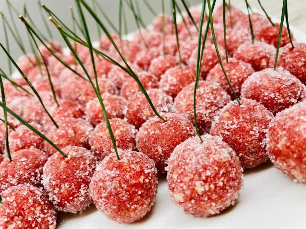 Co budeme potřebovat: 260 g čajových sušenek 120 g rozpuštěného másla 60–70 ml rumu 50 g moučkového cukru 60 g mletých mandlí Červené potravinářské barvivo Krupicový cukr (na obalení) Borovicové jehličí (na dekoraci) Jak budeme postupovat:
