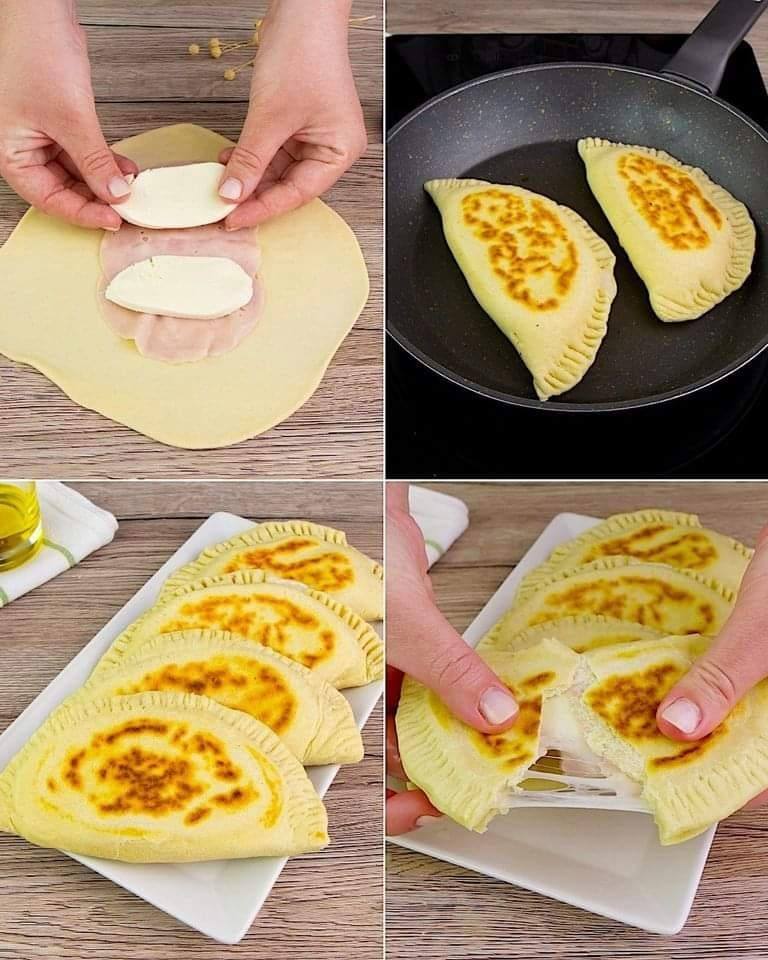 Složení Mouka: 250 g (2 hrnky) Prášek do pečiva: 8 g (1/2 lžičky) Sůl: špetka Olivový olej: 40 ml (1/4 šálku) Voda: 120 g (1/2 šálku) Šunka: podle chuti Mozzarella: podle chuti Metoda přípravy Příprava těsta: