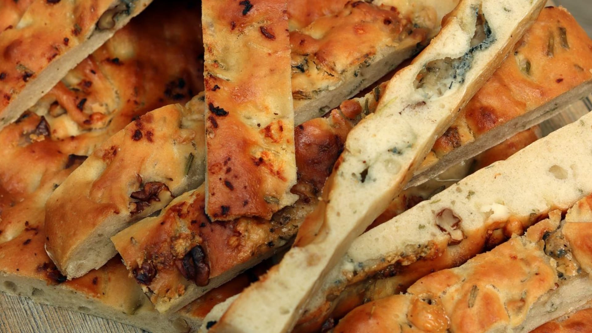 Focaccia je jednoduchý kynutý chléb původem z Itálie. Základní těsto lze dochutit různými bylinkami, sýrem a zeleninou. Vyzkoušejte variantu s modrým sýrem a ořechy. Focacciu lze nakrájet na proužky a podávat s dipem či pomazánkou, nebo ji servírujte jako přílohu ke grilovanému masu, polévce nebo pečené zelenině.