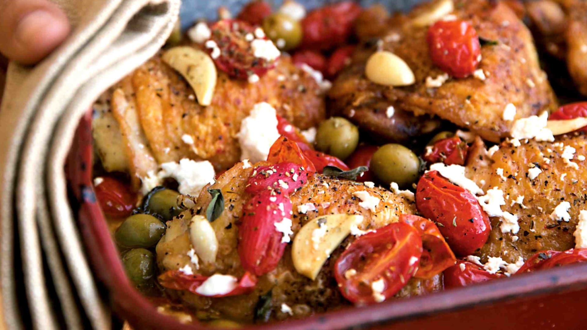 Závan léta a prázdninové idyly i uprostřed hektického týdne. Slaný sýr feta si báječně rozumí s voňavým oreganem, nasládlými pečenými rajčaty i trpkostí zelených oliv. Pokud máte raději jemnější chutě, vyměňte je za černé olivy, které jsou vyzrálejší. Jídlo doplňte restovanými lístky špenátu nebo čerstvým chlebem či bagetou. Hodí se i pečené brambory.