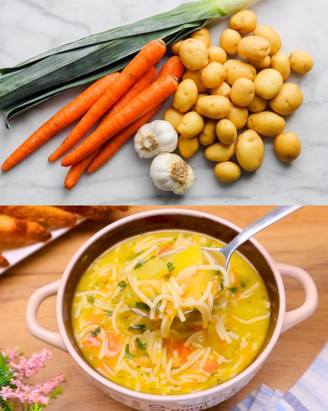 Dnes připravujeme vydatnou a chutnou zeleninovou polévku s pórkem a domácími krutony. Tato chutná polévka je plná výživné zeleniny a ozdobená lahodnými domácími krutony, takže je perfektním jídlem pro každé roční období. Pojďme na to!